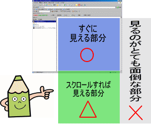 現在ほとんどの人がスクロールボタン付のマウスを使用しているかと思いますので、多少縦スクロールがあっても苦にはなりませんが、横スクロールの場合はわざわざスクロールバーをクリックしてずらしていかないと隠れている部分が見えません。