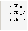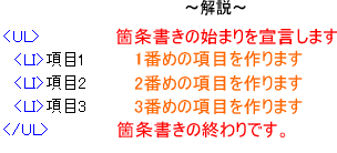 実際には箇条書きをつくる「UL」タグと、項目をつくる「LI」タグを組み合わせて使います。ちょっと難しいので、説明と合わせてご覧下さい。